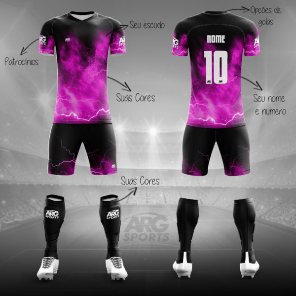 Uniforme personalizado para Futebol confeccionado em Dry Fit com proteção UV. Estampa sublimada, sem limite de cores ou patrocinadores, incluso nome, numero e escudo personalizados.